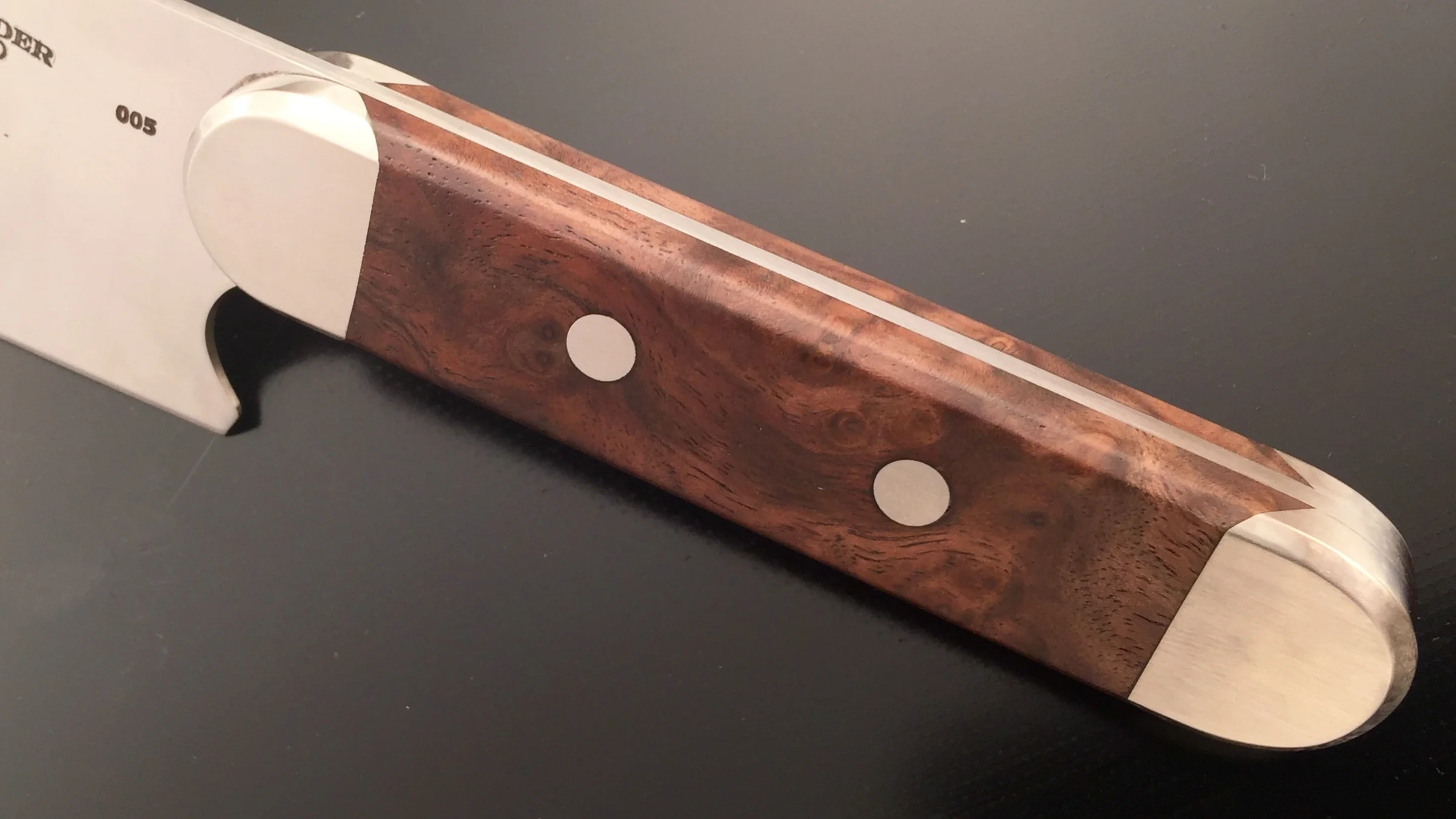 Our Chef's Knife, inspired by the traditional German pattern, incorporates unique designs to improve utility and style. Blade length measures 8 1/4", overall length is 12 3/8". These knives are available in 1095 Carbon, 440C Stainless & Elmax Stainless Steels.